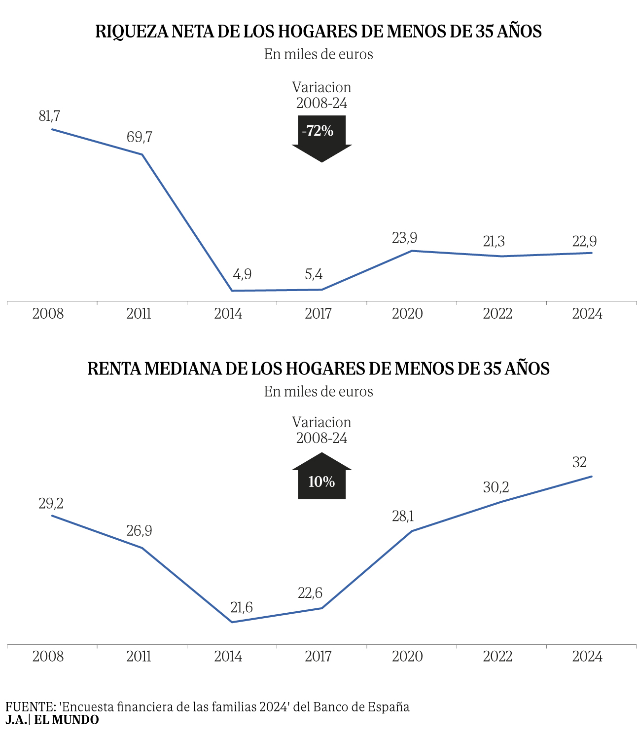 Según la 'Encuesta Financiera de las Familias 2024' elaborada por el Banco de España, los hogares donde el cabeza de familia es menor a los 35 años han sufrido una pérdida notable de patrimonio desde el estallido de la crisis financiera. En concreto, en el periodo comprendido entre 2008 y 2024 su riqueza neta se ha desplomado un 72%, pasando de los 81.700 euros del año del estallido de la crisis a los 22.900 euros de hace dos años.